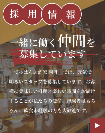 愛知県名古屋市西区新道にある 「てっぱん居酒家 阿吽」は、 鉄板料理を中心にこだわりの味を ご提供する居酒屋です。 当店の魅力は、長年の経験から 生み出した「秘伝のタレ」と 「オリジナルソース」。 料理に合わせて使い分けることで、 同じ鉄板料理でも一皿ごとに 異なる深みと香りを 楽しんでいただけます 他では味わえない 阿吽ならではの味わいが、 多くのお客様に ご好評いただいております。